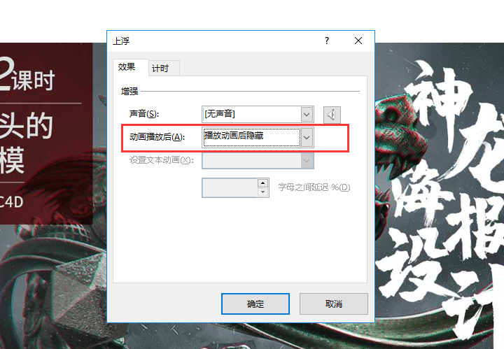 4.弹出对话框,可以对动画进行设置。选择播放动画后隐藏,如果需要点击鼠标后进行隐藏,可以选择下次点击后隐藏。最后点击确定就可以了。