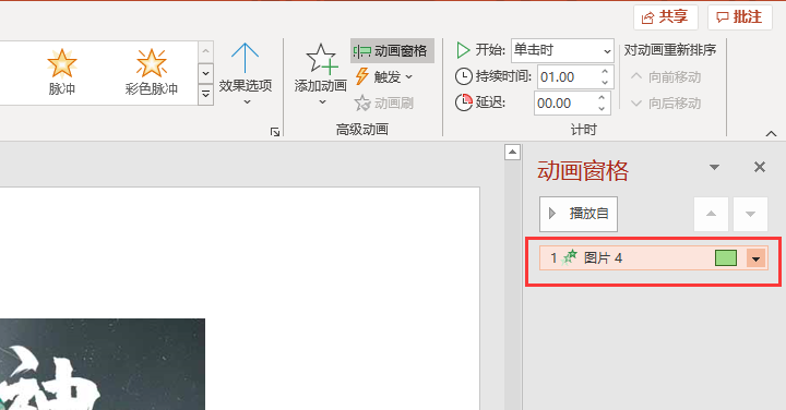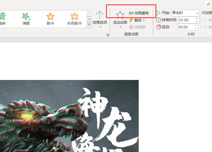2.点选动画编辑栏右侧高级动画窗口的【动画窗格】,在右侧弹出动画窗格。
