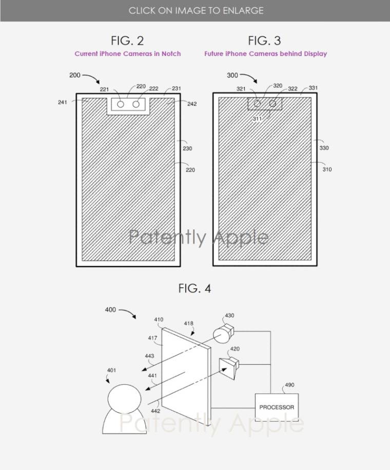 图。上面的图 4 说明了未来的环境,其中相机也可以隐藏在显示屏中间的屏幕下方。苹果指出,“尽管#420 摄像头不一定与#410 显示器接触,但与#417 前表面相比,摄像头更靠近显示器的背面(#418)。”