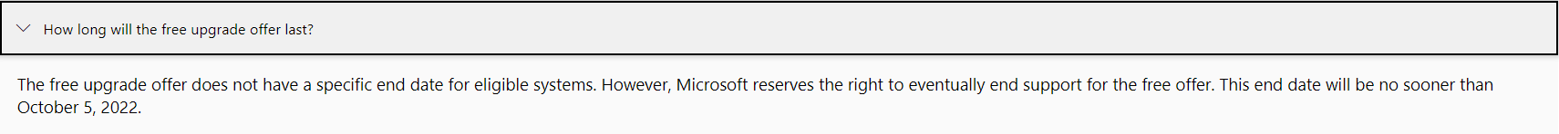 Redmond 官方表示,免费升级优惠对于符合条件的系统没有具体的结束日期,但微软保留最终终止对免费优惠支持的权利。