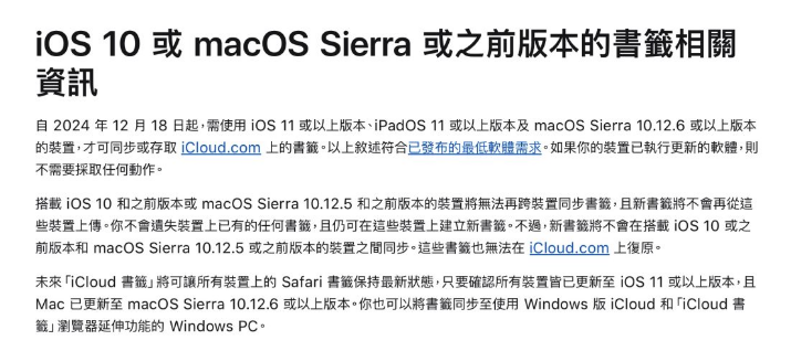 苹果的官方声明指出,从12月18日起,iOS 10以下版本的iPhone或iPad,以及macOS 10.12.5以下版本的Mac,将无法跨设备同步Safari书签。新建的书签也无法上传到iCloud进行同步或恢复。苹果表示,这项变动是为了更好地符合iCloud的最低系统需求。