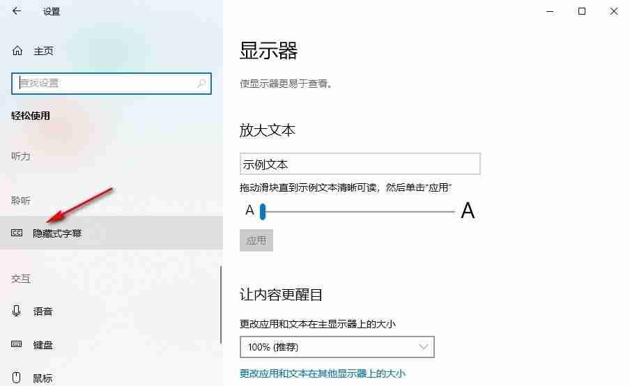 3、第三步,进入轻松使用页面之后,我们在左侧列表中点击打开“隐藏式字幕”选项。