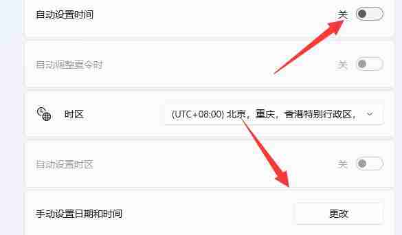 第六步:如果由于网络连接问题无法自动同步时间,请关闭“自动设置时间”选项。(如下图所示)