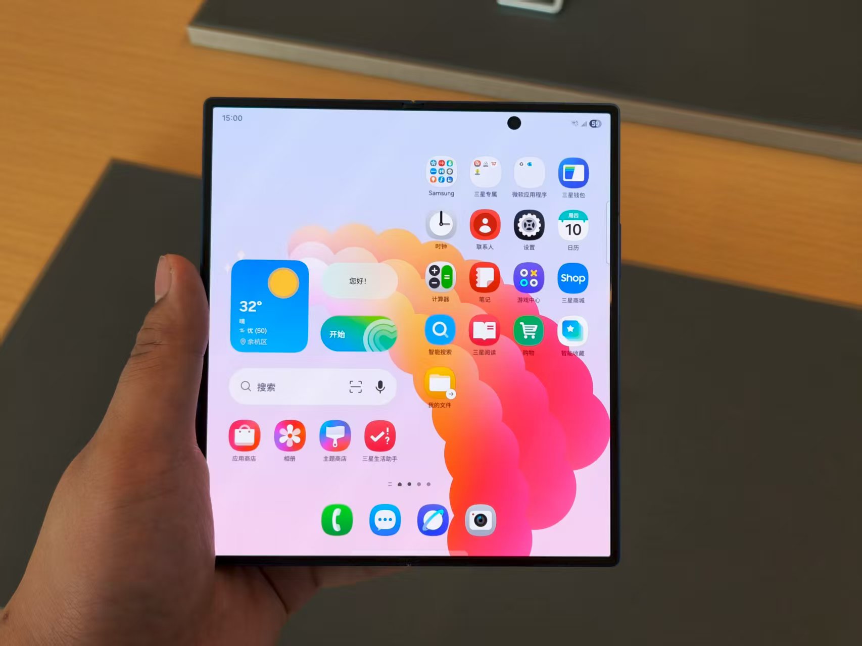 如果你和我一样,觉得“超大杯”手机也挺顺手,那么Galaxy Z Fold7的握持感确实不错。它采用了相对硬朗的线条设计,没有为了偷薄而采用悬浮中框。这种设计带来了更一体化的触感,同时也更好地“包裹”了屏幕,提升了跌落防护性能。