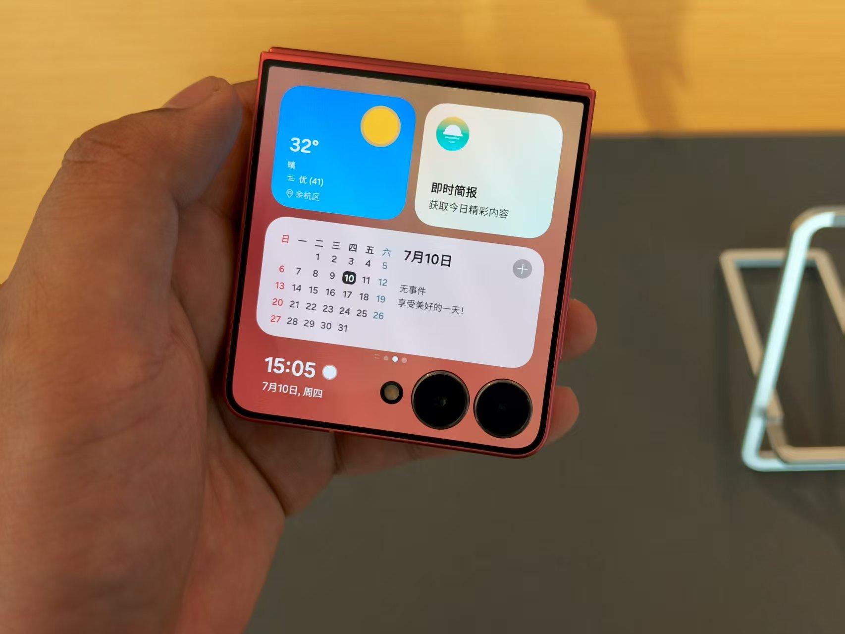 更大的屏幕显示面积为Galaxy Z Flip7带来了更丰富的外屏交互方式:传统的小组件可以在外屏上显示更多信息,自拍时也可以显示大的画面;搭配OneUI 8.0的“实时窗”组件,一些过去必须翻开内屏才能使用的操作现在也可以在外屏上完成。