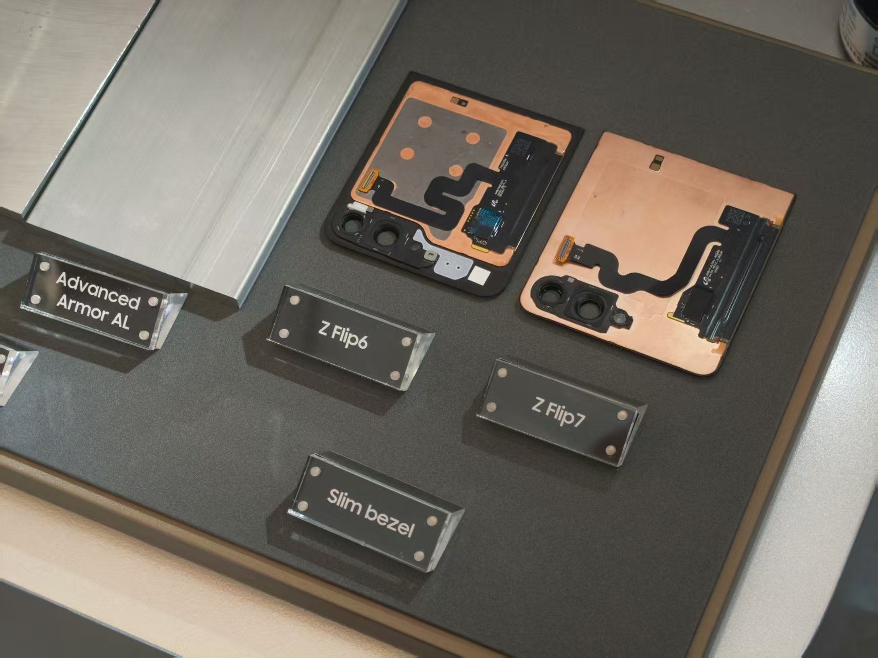 那么,Galaxy Z Flip7的超窄外屏边框是如何实现的呢?三星在体验会现场展示了Galaxy Z Flip7和Galaxy Z Flip6的外屏组件。可以看到,Galaxy Z Flip6的外屏组件最外侧有一圈非常宽的防水保护层,而Galaxy Z Flip7只有一个“裸屏”。