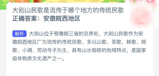 今天的蚂蚁新村题目来啦!你知道大别山民歌是哪个地方的传统民歌吗?答对就能为你的小镇建设加速哦!