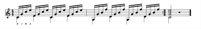 我们会发现第一个音会有向上和向下两种符杆显示,这在五线谱中符杆的意义是非常大的,符杆的方向不同就表示音符所在的声部不同,第一个音符同时具有两个符杆意思就是说这个音即属于上声部,也属于下声。当然如果把第一个音在上声部中排除,这也是完全可以的,一般不会影响音响效果,也就是说这两小节听起来是完全一样的,不同的地方就是前一种做起来非常简单。