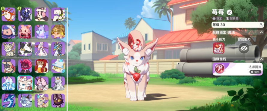 莓狸狸在游戏当中因为元理是饱足,所以作为初期喜欢用饱足流派的玩家来说,这个精灵是一个必选的精灵,它的特性是智多星,身高达到了95cm,但是能量上面可能需求比较高,要58能焦,它在游戏当中外观就是看起来一个草莓味道的小狐狸,而且身上有很多草莓的装饰,以及头顶还有草莓果酱的冰淇淋一样装饰,所以在游戏当中它带来一些输出的时候都是会有一些类似于扔蛋糕的特效。