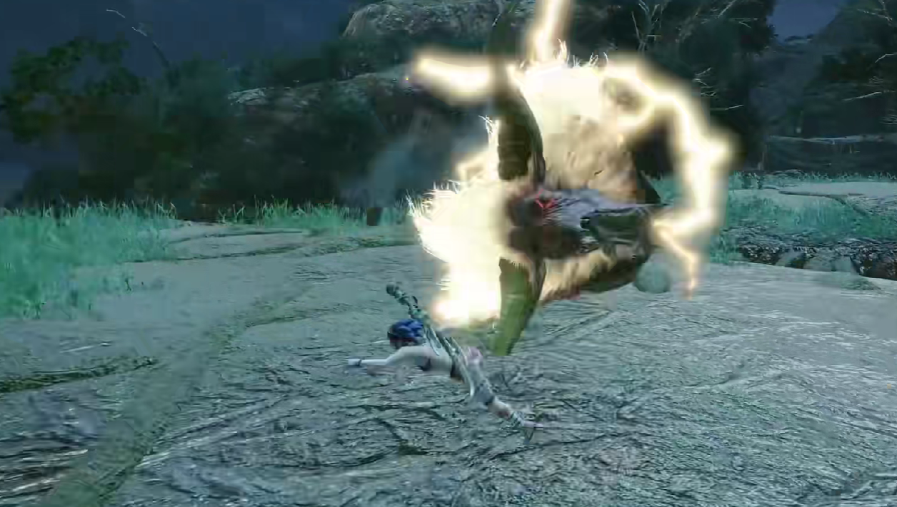 当然,双刀也是个不错的选择。输出时,保持鬼人化状态。当怪物疯狂甩尾巴时,会有一个下压动作,这时候就是攻击的好机会,直接用乱舞攻击命中头部。
