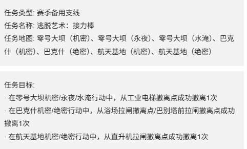 S7赛季的“逃脱艺术:接力棒”任务,需要各位特战精英们展现你们的撤离技巧啦!具体来说,就是要分别在零号大坝、巴克什以及航天基地的特定地点成功撤离。听起来是不是有点刺激?下面就为大家奉上详细的攻略,助大家顺利完成任务!