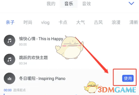 4、在音频列表中,你可以选择软件自带的音乐,也可以点击“使用”按钮,从本地导入你喜欢的音乐。选好后,点击“使用”就OK啦!