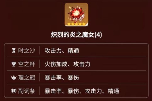 1、炽烈的炎之魔女(4件套): 提升火元素伤害,并增加元素反应伤害。