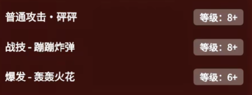 四命·一触即发: 如果在轰轰火花持续期间内退场,会引发爆炸,造成大量火元素范围伤害。