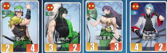 到了中期,资源慢慢积累起来了,就可以开始转向二星卡牌了。蜀卒、白兵、诸葛果和李元芳是这阶段的核心。它们分别能提升相邻单位属性、增益指定单位、快速获取补给卡以及触发连击先手。特别是李元芳,通过多次叠加成长机制,属性可以达到一个很高的水平,在二星阶段就能形成很强的压制力,是过渡期的关键战力。