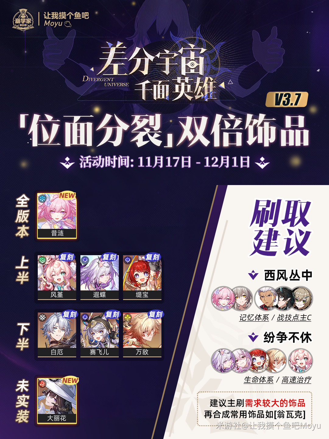 崩坏星穹铁道V3.7位面分裂双倍饰品刷取优先级推荐,考虑忆灵常驻&全队增益的需求,常规选择[翁法罗斯]套即可,实在刷不出来再考虑词条优秀的[妖精套]或者其他速度类饰品。