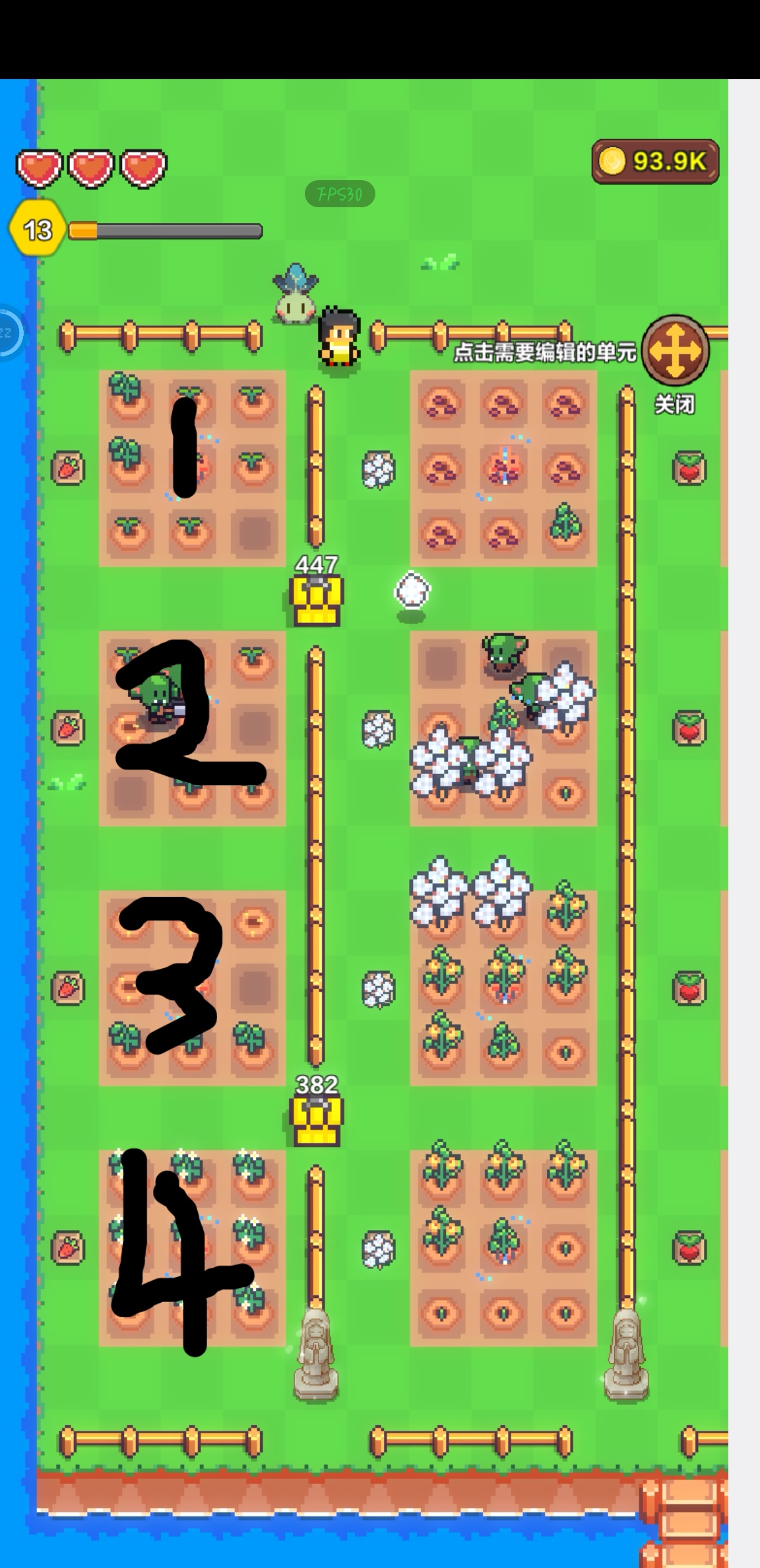 1、首先,把四块田地排成一列,这就是一个收割组。我一般会安排三个哥布林负责一个组。(图1)