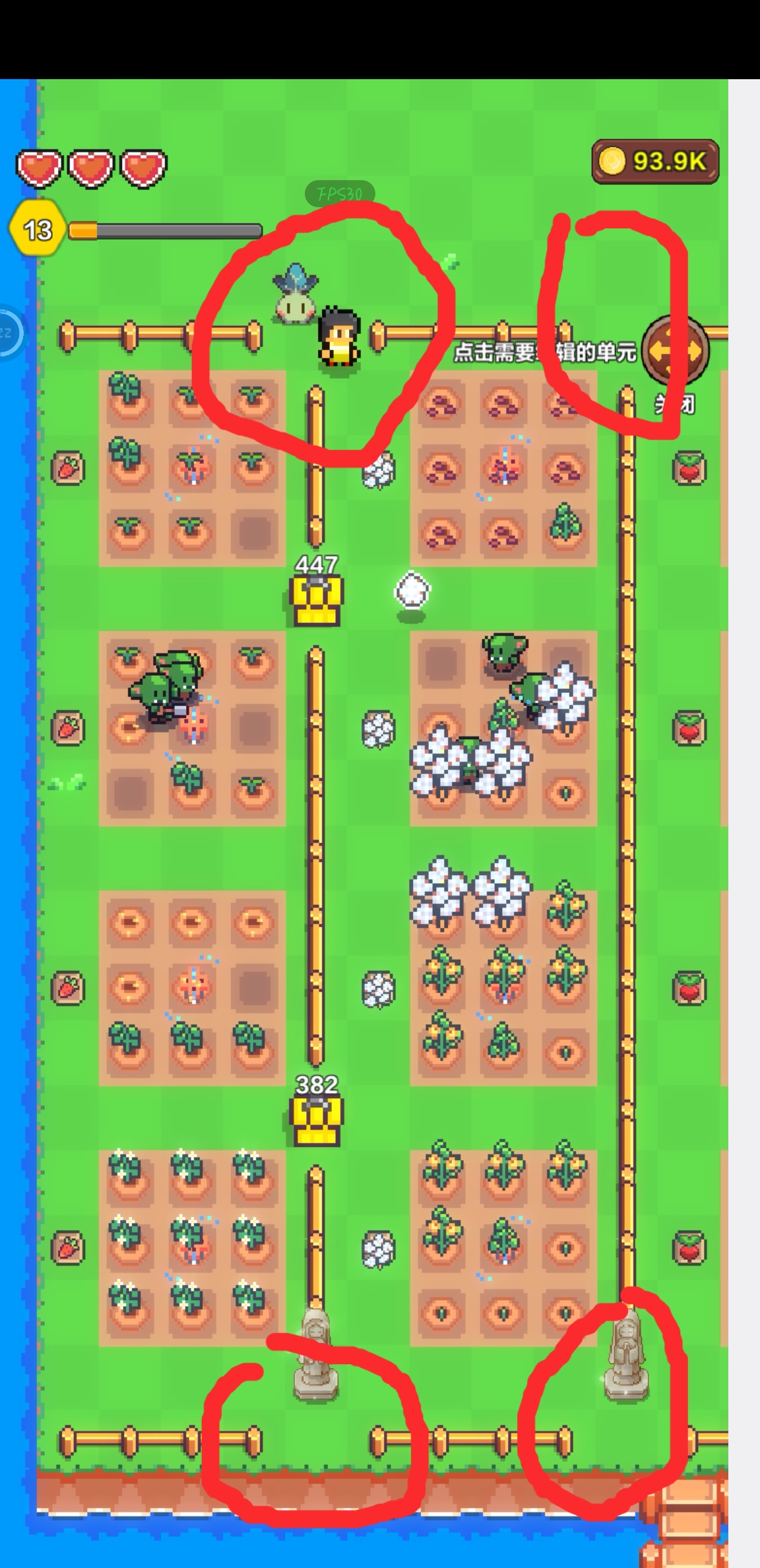 5、在每块农田中间放置一个浇水器,实现自动浇水。注意,刚买来的浇水器不能直接放在田中间,需要先随便放在旁边,购买后再移动到田中间。