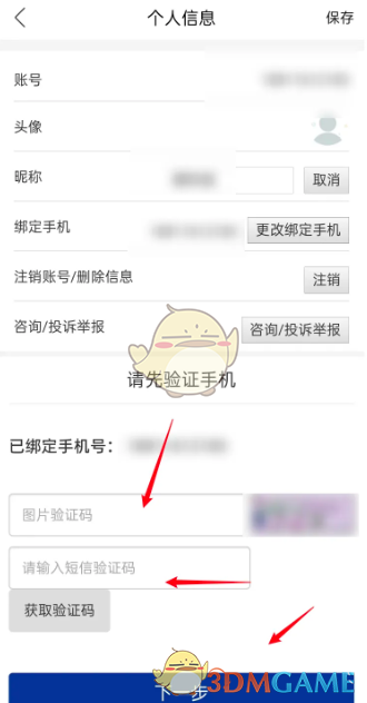 3、这时会进入一个新的界面,你需要输入图片验证码,然后获取并输入手机验证码,点击“下一步”。