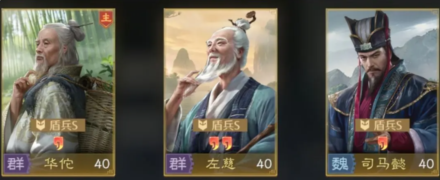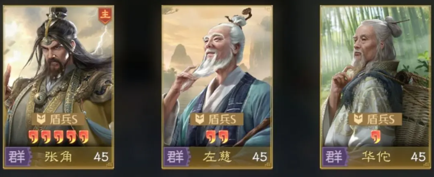 三仙盾阵容其中的3个武将其实能力上面都是偏辅助一些,但是搭配在一起的话,整体效果就有足够的全能阵营效果加成,这里用到的主将就是群雄阵营当中的张角,然后另外两个位置放左慈加华佗,这个阵容如果后期想要进行变换的话,也可以将其中的张角变换成司马懿这样的话就变成中毒盾了,其中搭配的思路大家可以注意,因为主角放的是张角,他作为主将的话,其实输出效果是有的,但是因为面对的敌人强度非常高的时候,他的输出数值没有那么足够,所以给他搭配一个左慈,这样让整体阵容里面有双核的输出数据就足够了。
