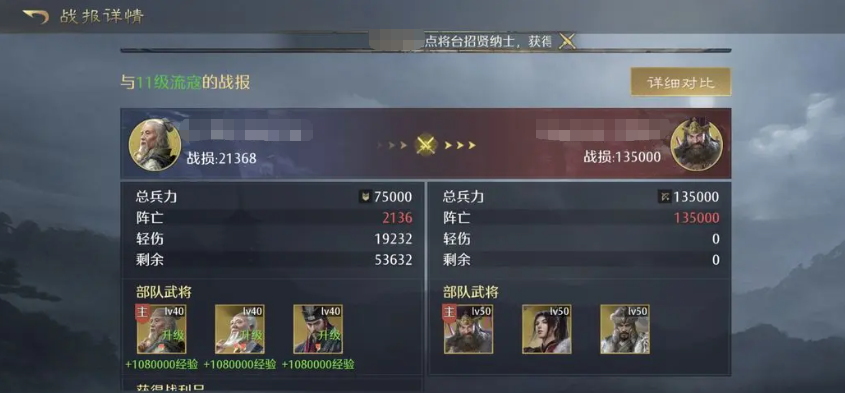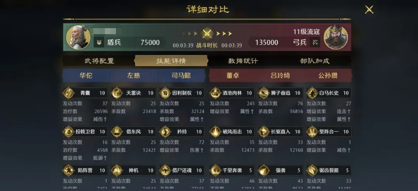 比如说华佗这里可以带的是轻兵急行、乐善、奋鼓,而左慈的话可以带并气积力、活力、固阵,如果是张角的话,这里可以带的兵法是惜兵爱民、活力、固阵之类的兵法,有足够的兵法加成,可以为这个阵容带来足够的标准提升效果,相应的初期变化角度来说的话,其实它带来的整体能力效果上面是非常适合参与前期开荒的,在战报里面大家也可以看到它的一些详细对比,以及其中胜利的概率有多大。