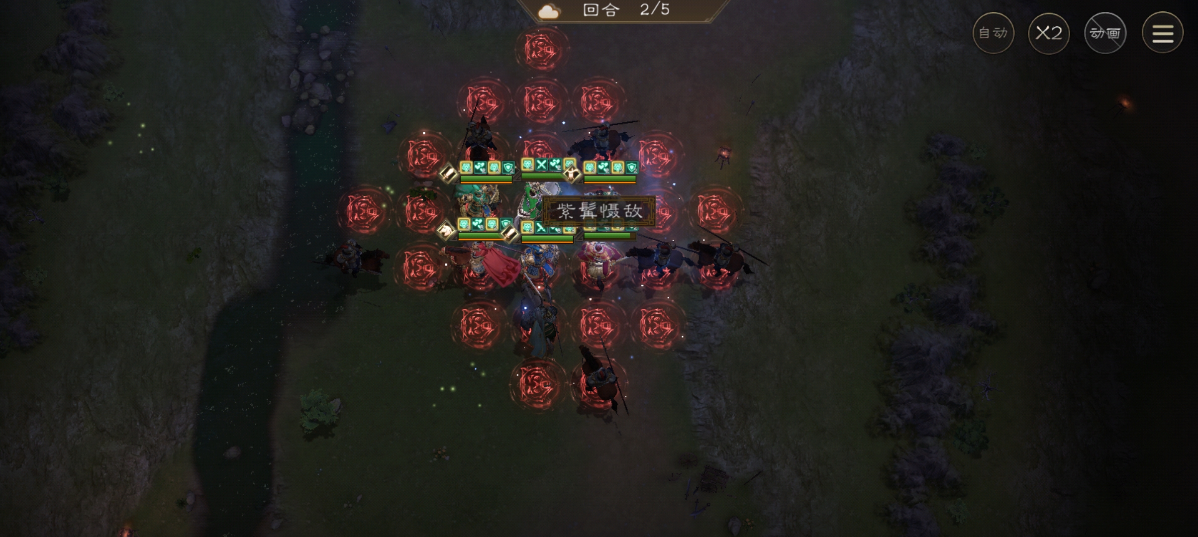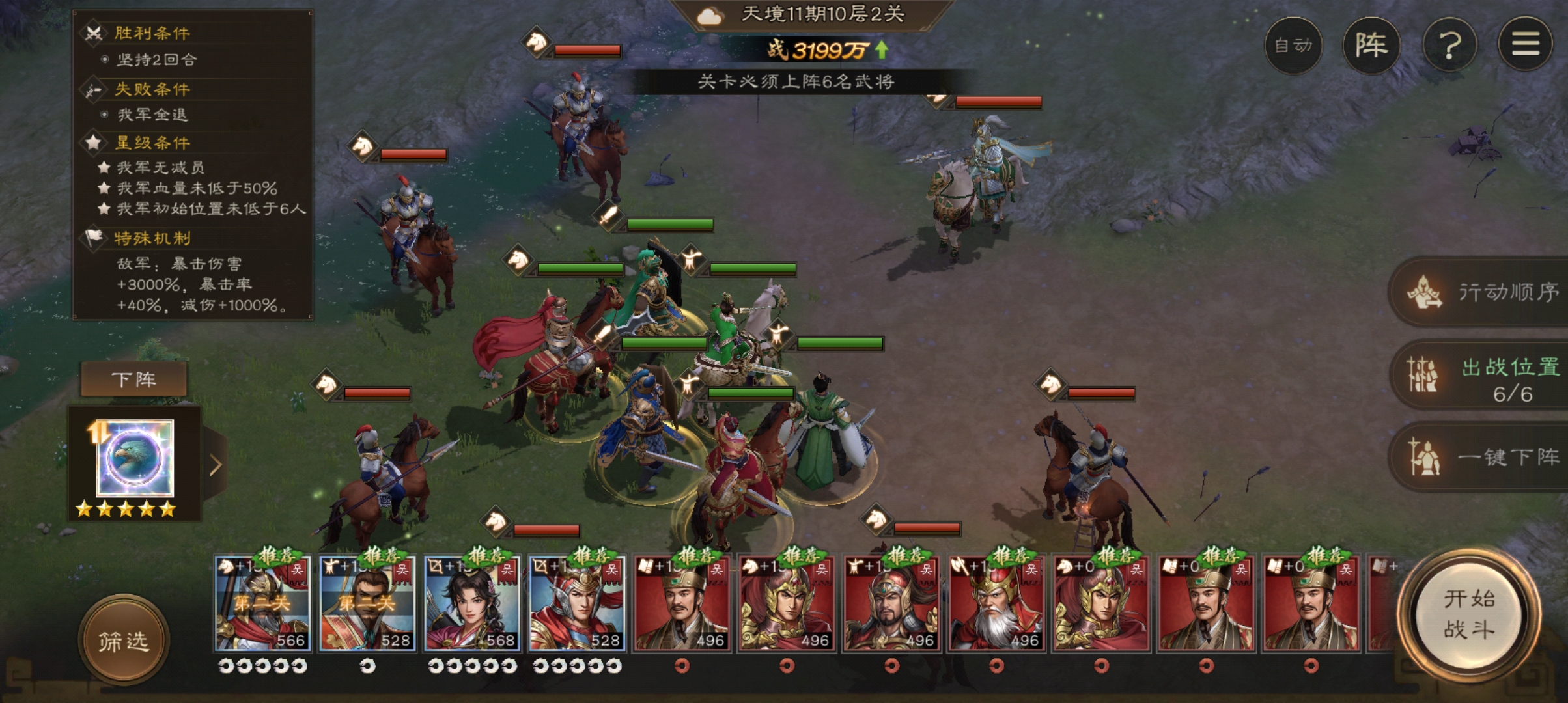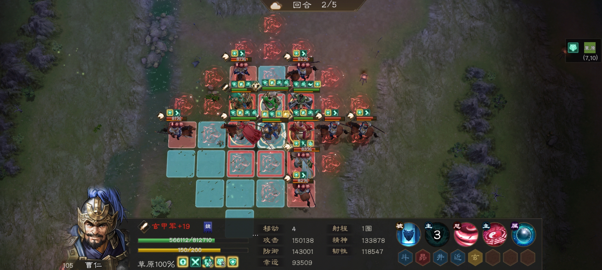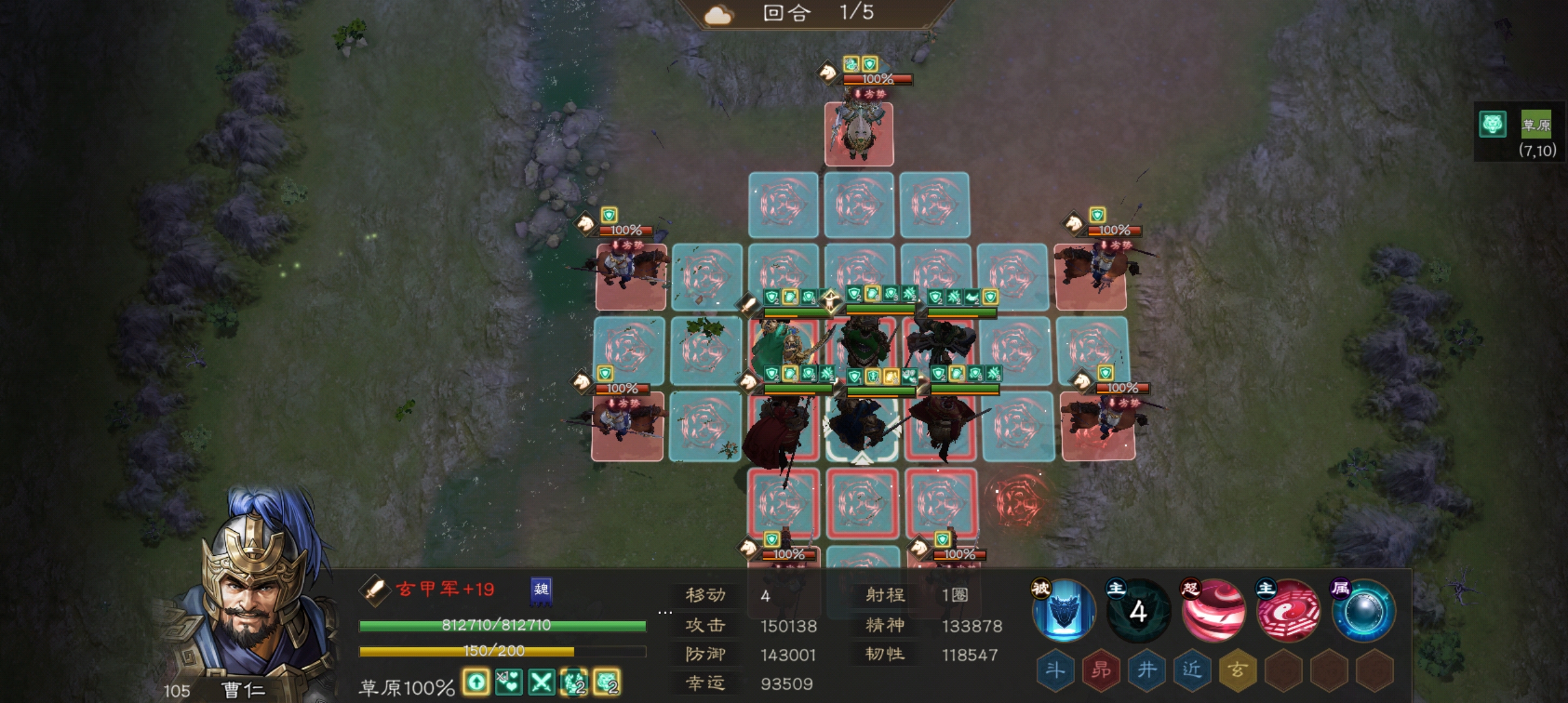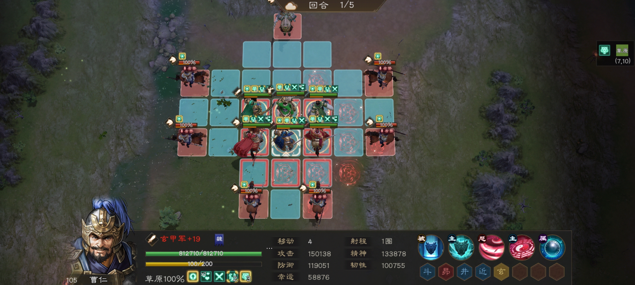 曹仁站在后面中间,把最脆的放在后面的任意一侧(我的孙权防御最低,就放右下角了)。神兽可以带减敌军幸运或加己方生命的。