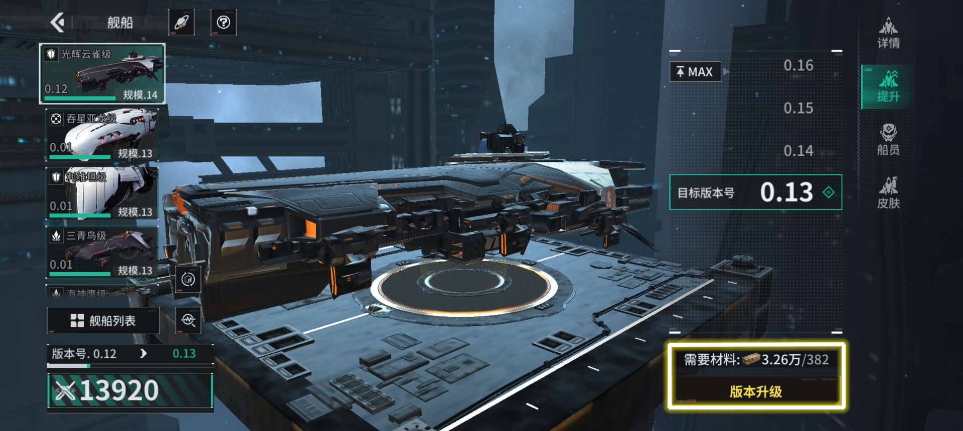 在舰船界面,你可以通过右侧的操作栏对战舰进行升级,从而提升其整体性能。最方便的就是选择指定的版本号进行快速升级,省时省力!
