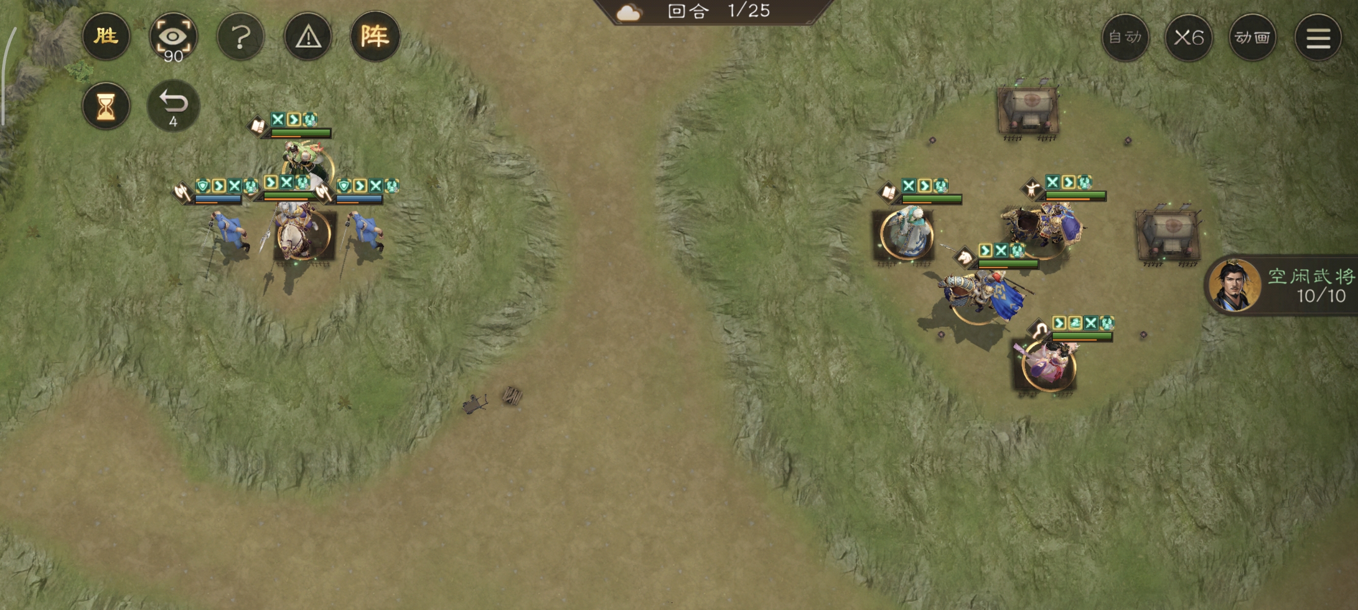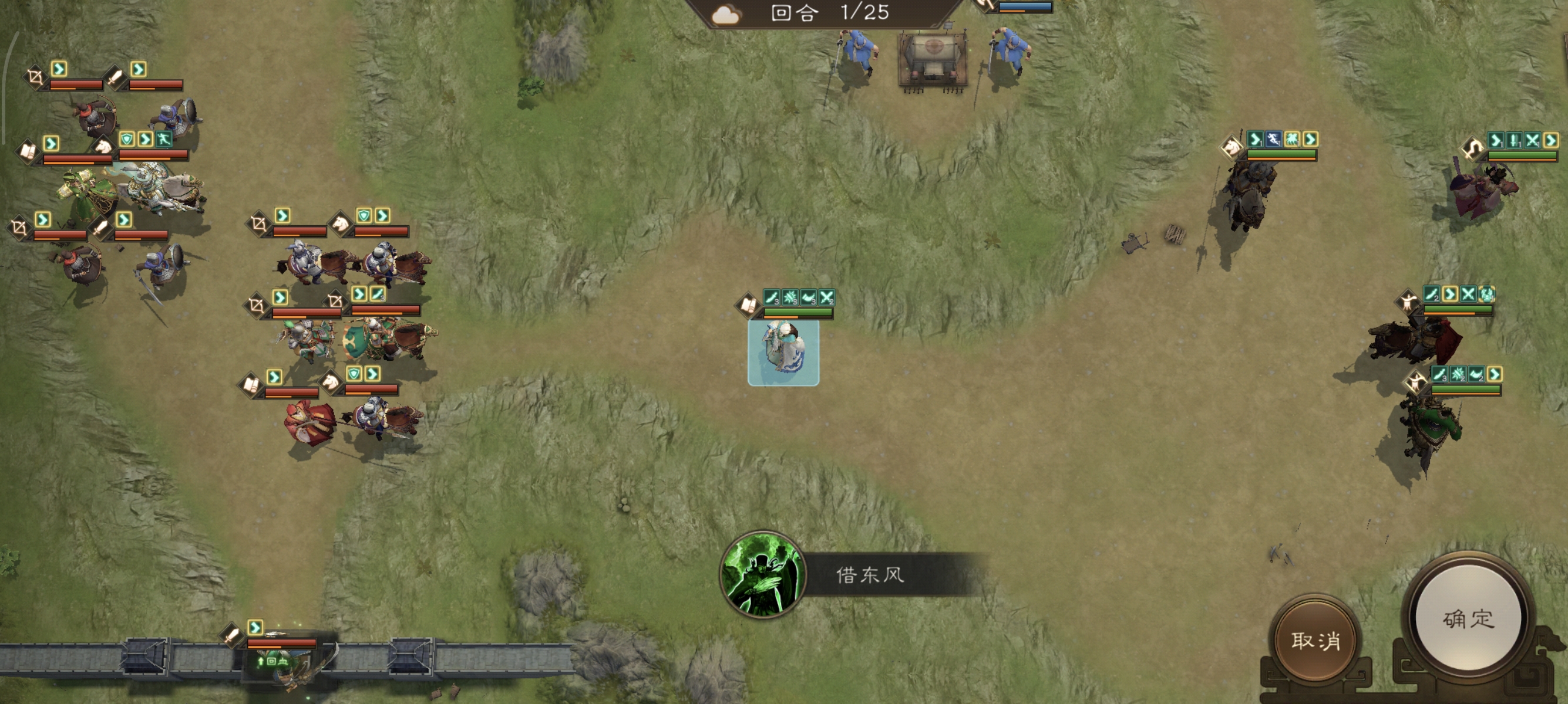 一开始,我军会被分割成好几个小战场,所以想要一回合直接通关基本不可能。这关的重点在于如何最大化地给诸葛亮刷满各种buff。