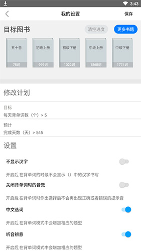2、点击“设置”按钮,选择你想学习的词汇书,也可以根据自己的情况修改学习计划。