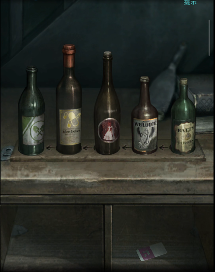 5. 墙上的文字顺序非常关键!根据它的提示,重新调整左边桌上瓶子的摆放顺序。一旦顺序正确,你就能拿到通往二楼的门禁卡了。是不是感觉离真相越来越近了?