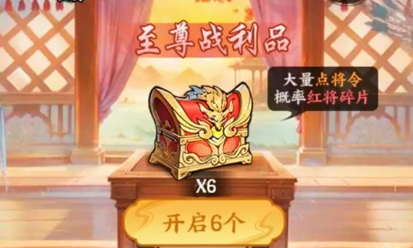 5.至尊战利品:这个可厉害了!打开必得点将令,运气好的话,直接来个10倍暴击,瞬间点将令就多了好几十个!而且还有机会开出稀有的红将碎片,简直是欧皇福利,强烈建议多收集!