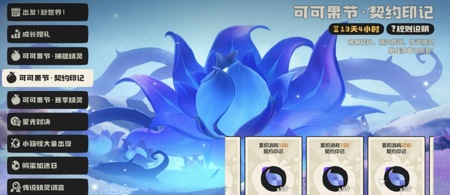 活动一共分三个部分。第一个任务是捕捉精灵,抓满80只就能把这部分奖励全拿到手。这个任务基本没难度,平时在大世界随便逛逛就能完成。第二个任务要消耗契约印记,也就是体力值,总共要消耗500点才能领完奖励。每天刷刷花种精灵啥的,体力很快就用掉了,所以这个任务也算轻松。