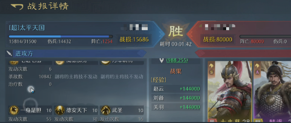 赵云在激活一身是胆技能后,将迎来输出的巅峰期。这一个技能不仅可以为他提供120点武力加成,还有统帅加成,还能让后续每一次攻击都会必定暴击,直接斩获50%的额外伤害提升。如果是满红赵云,暴击伤害的倍率也会从150%直接提升到200%。即便只是一星到三星的低红赵云,也可以通过这一个技能去打出碾压级的输出,实战的表现是比较亮眼的。阵容中的另外两个武将,也可以给体系提供关键的支撑。刘备不仅靠青州军盘活反击链,普通的攻击,还会有兵力恢复的效果。让整个阵容在持久战中都会变得比较有底气,关羽则成为了辅助性较强的一个角色可以给全队带来80点武力加成,还有兵力回复。