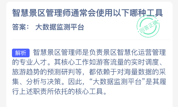 智慧景区管理师通常会使用以下哪种工具?【蚂蚁新村每日一题】2025年12月14日题目已发布!坚持答题,积累木兰币,即可加速小镇建设。答对本题,立即可享“产速+3/时”的加速奖励!今天正确答案是【大数据监测平台】。智慧景区管理师是负责景区智慧化运营管理的专业人才。“大数据监测平台”是其履行上述职责所依托的核心工具。