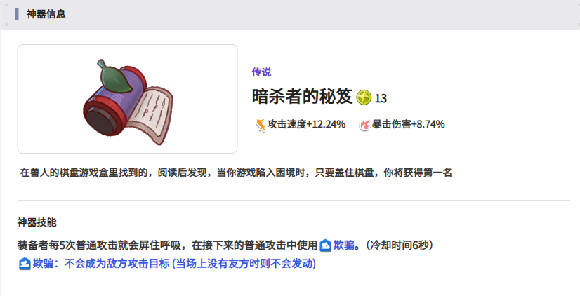暗杀者的秘籍也很不错,也有一定的攻速提升效果,不过在暴击伤害这方面有一定的加成,所以装配的装备在攻击的时候,如果次数达到5次,那么会拥有一次欺骗效果施加给敌人。