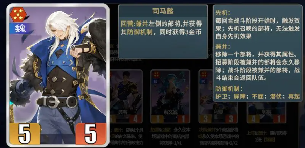 在资源获取方面,主要是围绕军祭酒构建的阵容。需要选择先囤积魏国卡牌,白虎还有甄姬就是稳定的获取方法。每一个回合都能精准的拿到魏国的核心卡,青龙和军祭酒的组合也能有效利用上阵的效果,触发多次兼并的优势。另外还可以定向养成典韦以及夏侯淳,前期就可以预留九尾以及玄武,注意要控制场上魏国部将的数量。避免九尾给到中立牌,确保资源可以精准的倾斜。