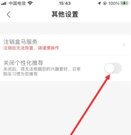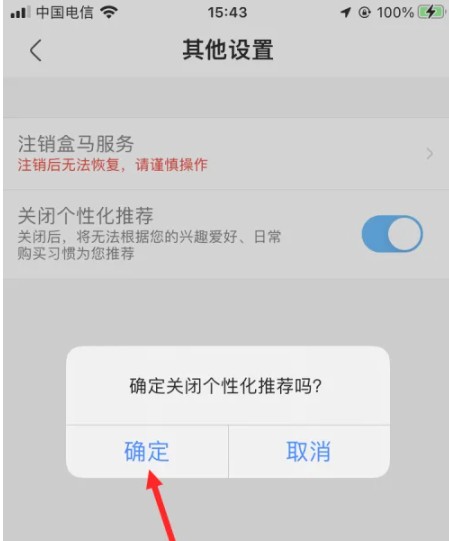 盒马鲜生app怎么关闭广告推送,首先在手机上打开并登录盒马鲜生,并在首页面点击【我的】,进入个人页面后,点击【齿轮】,这样会进入【设置】的页面,在该页面里点击【其他设置】,再点击【关闭个性化推荐】后面的按钮,最后,点击【确定】即可。
