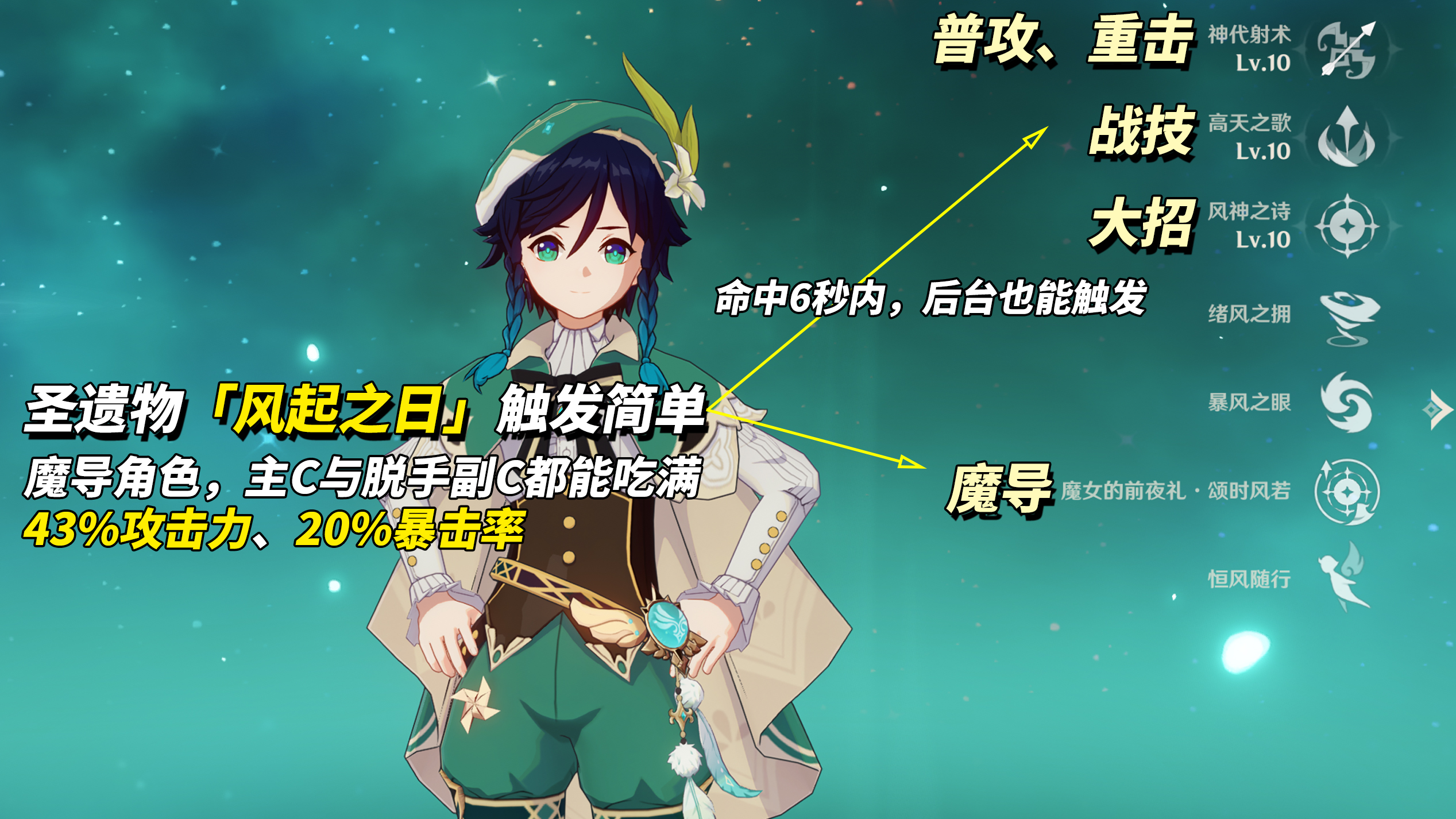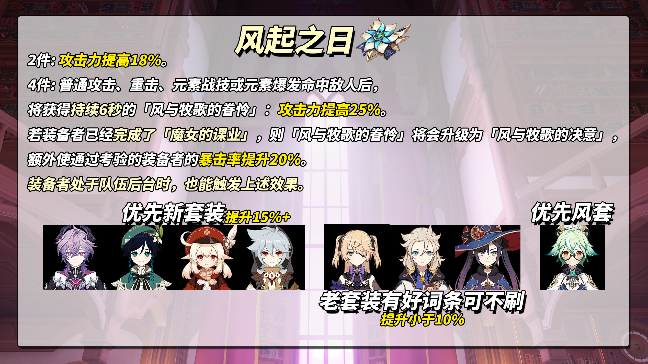 对非魔导角色,圣遗物「风起之日」并未比2+2强多少,意义不大。只推荐魔导角色使用,战场主C与脱手副C都可全程吃满增益,可直接视为43%攻击力、20%暴击率。