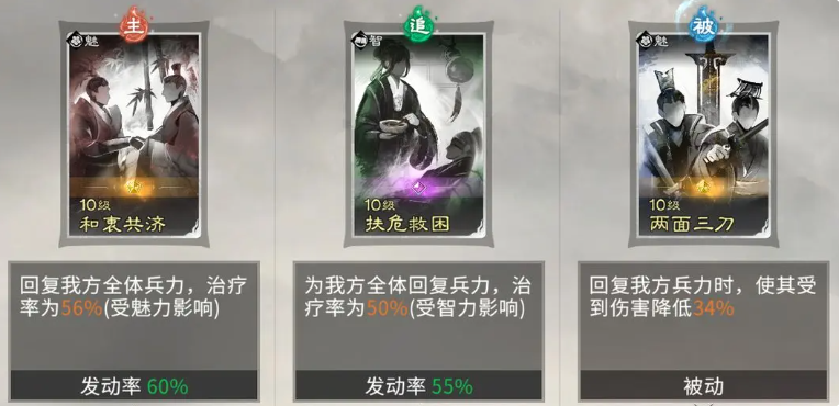 惟贤惟德技能效果触发的时候,刘备一战斗开始就可以获取到两层仁德的状态进行积累,而且在每一个回合开始的时候,他获得的个人的状态上限就可以达到5次,所以在己方单位受到伤害之后,他只要消耗掉其中一层仁德的话,就可以给这个角色带来30%的病例恢复,当然了这个30%的数值不是一定的,如果还有魅力加成的话,他这里会受到魅力状态的影响,在这个角色兵力数值缺少了百分比之后,基础是缺少了30%的时候,利用仁德带来的恢复系数也会进行提升,所以目前刘备作为辅助类型角色效果来说的话,他能够产生的质变效果,依靠天赋就可以快速的克制一些有高频率伤害的敌人。