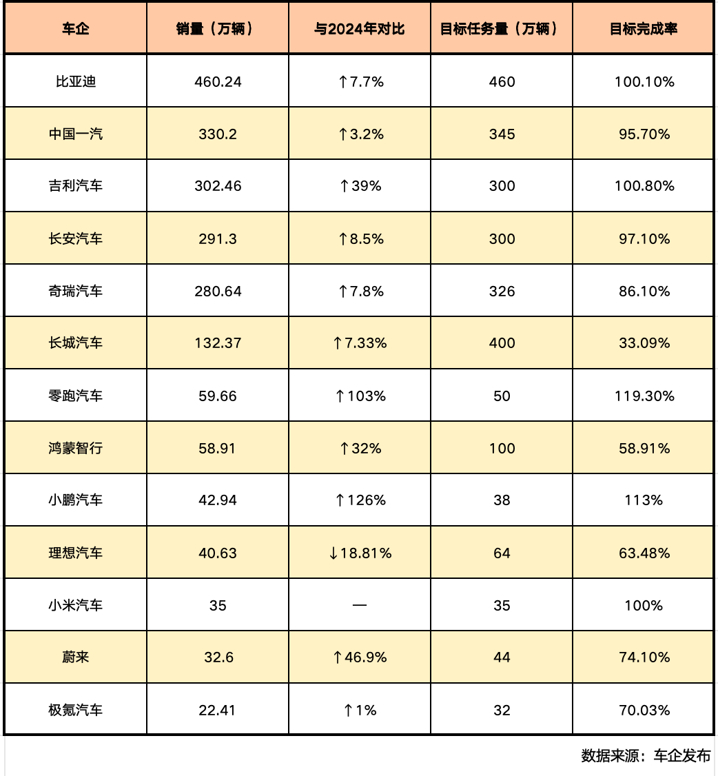 2025年各车企销量目标完成情况呈现显著差异: