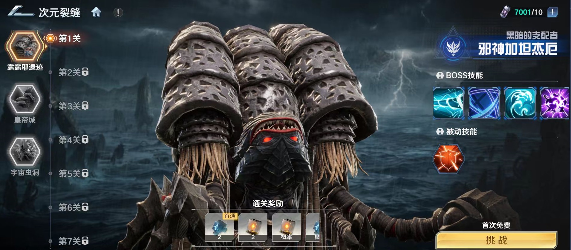 参与“次元裂缝”需角色等级达到25级,满足条件后可在主界面【宇宙港】入口直接进入。该活动共设三大主题副本:露露耶遗迹、皇帝城、宇宙虫洞,每个副本均拥有独立剧情背景、专属BOSS及差异化机制设计。玩家可自由选择任一副本发起挑战,成功击败对应BOSS后,将稳定获取角色潜力值、突破材料、专属养成资源等关键道具。