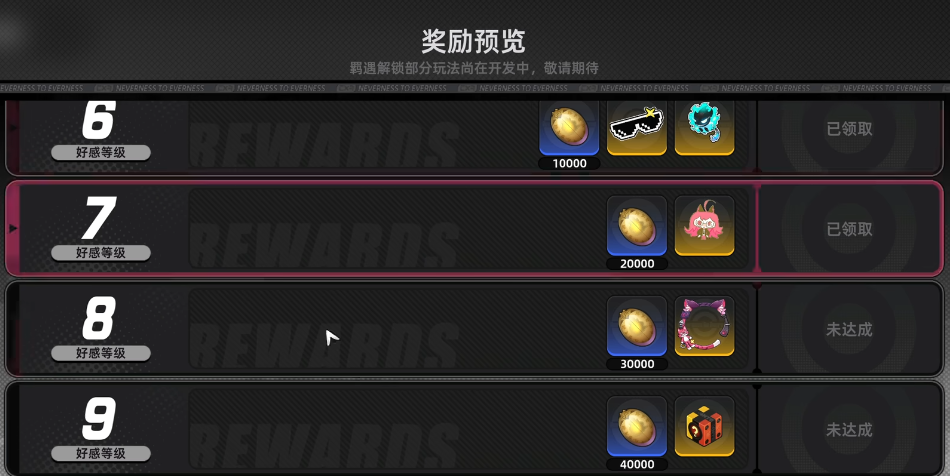 主线免费渠道为角色好感度养成系统。在角色详情界面可实时查看当前好感等级。提升好感度最高效的方式是赠送契合其偏好的礼物——不同角色对礼物类型存在明确倾向性,精准投送可获得更高倍率加成。每提升1级好感度均设有固定奖励,自第6级起,每级晋升必得服饰类道具,涵盖基础时装、配件及主题套装碎片。