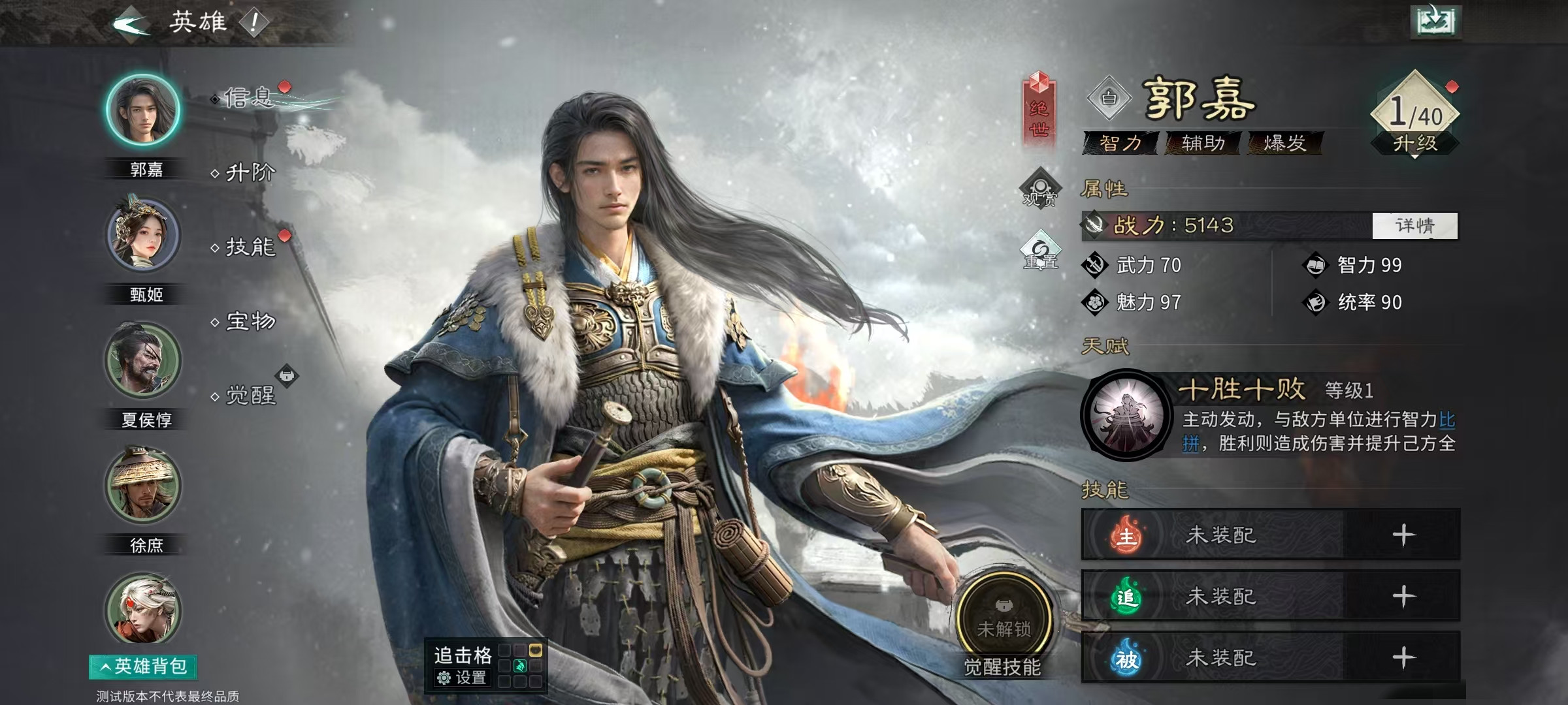 技能搭配上,郭嘉首选主动技【通权达变】,可随机削弱三名敌方单位攻击力,当敌方魅力低于自身时稳定附加混乱状态——鉴于郭嘉基础魅力值极高,该效果实际命中率接近100%;被动技推荐【兵无常势】,为全体友军提供可观减伤,有效提升队伍容错率。貂蝉技能组建议配置【通权达变】【临危不乱】【鼎力相助】,兼顾干扰、生存与辅助增幅;关羽则优先携带【万军取首】【齐射阵列】【兵不厌诈】,最大化其单体爆发、群体压制与战术机动性。