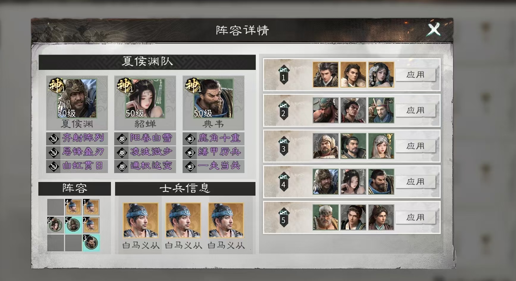 阵容搭配上,建议以典韦为核心构建“双骑一辅”体系:前排部署典韦+两名白马义从,承担主要伤害并激活骑兵协同效果;中排配置夏侯渊与一名白马义从,利用其追击天赋高频触发破甲与单体爆发;后排安置貂蝉,提供控制衔接与状态干预。白马义从作为高机动骑兵兵种,不仅补足前排硬度,更通过兵种特性强化整体输出节奏,使典韦的反击触发频率与团队输出效率同步提升。