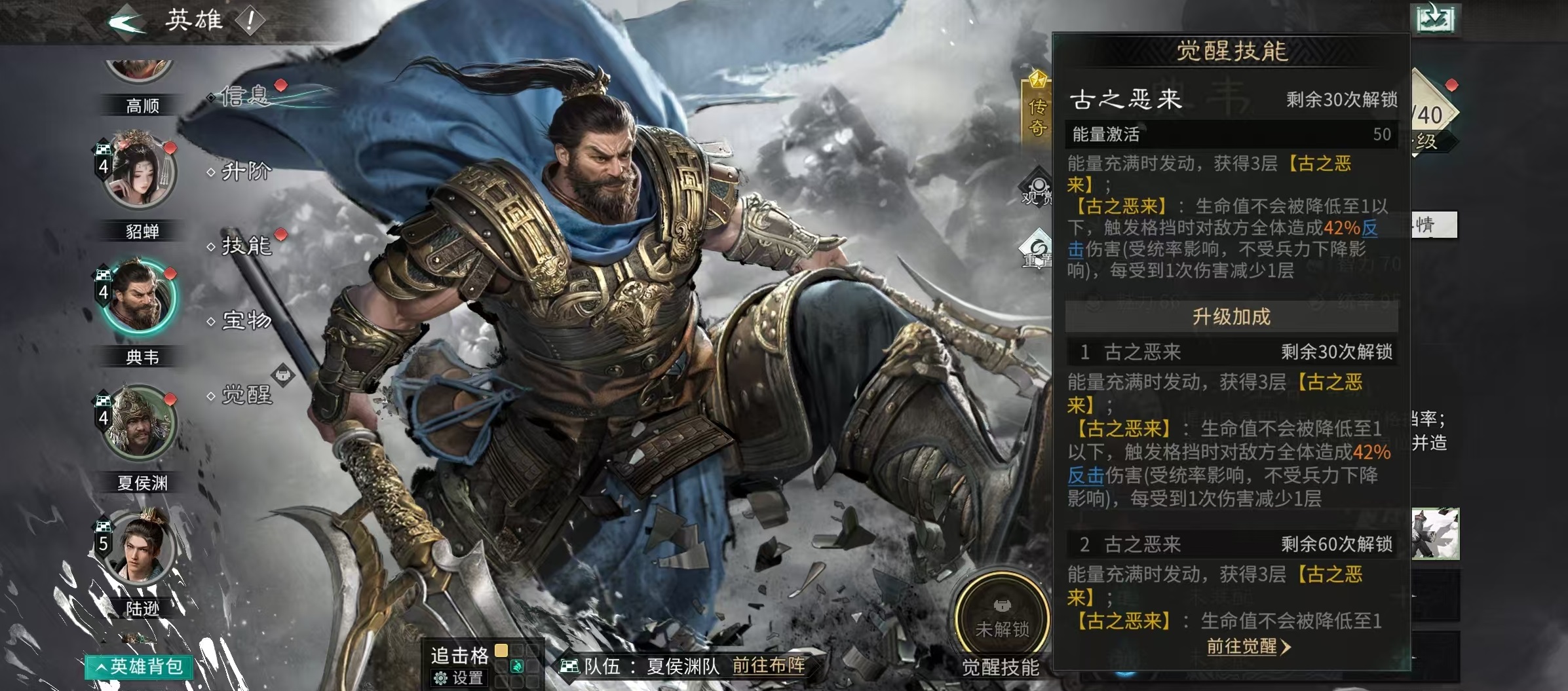 典韦的基础定位为统率型守护者,技能体系围绕“格挡—反击—挑衅—免死”四重逻辑构建。其核心天赋【折冲左右】可使自身及追击格单位获得12%格挡率;主动技能发动时,对两名随机敌方单位造成伤害并施加挑衅效果,强制其攻击典韦,有效分担队友承伤压力。当受到直接伤害时,有概率触发反击,且格挡成功后可提升该反击伤害。觉醒后解锁专属机制【古之恶来】:能量满时立即获得三层效果,每层提供“生命值不低于1”的绝对生存保障,并在格挡时对敌方全体发动反击;每承受一次伤害消耗一层,形成攻防一体的动态循环,显著延长持续作战时间与团战容错率。