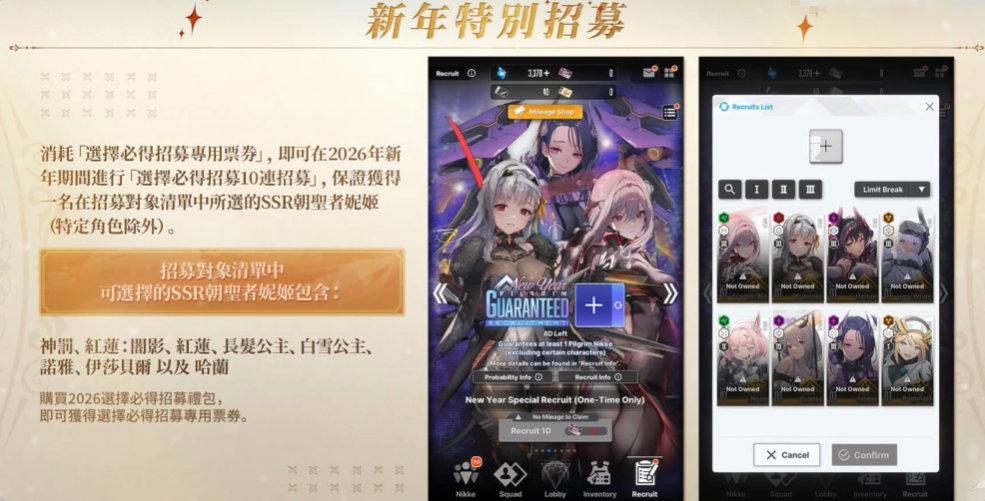 这次新春活动,预计会在2026年新年期间正式上线,采取的是一种非常给力的定向保底招募机制。活动一开启,所有玩家都能免费领到一张“新春特别招募专用票券”,这简直是福利!后续如果还想多抽几次,就需要通过限时礼包来获取更多票券了。这次招募支持10连抽,而且每次10连都保底会出一名指定的SSR角色——没错,就是大家心心念念的“朝圣者妮姬”!要知道,她们平时可不在常规的保底池里哦(当然,某些特殊角色除外)。这次的限定卡池阵容也是相当豪华,涵盖了像神罚、红莲、长发公主、白雪公主、伊莎贝尔等一大批高人气角色,她们不仅风格各异,战斗定位也多种多样,无论是为了收藏还是为了提升队伍强度,都非常值得入手。