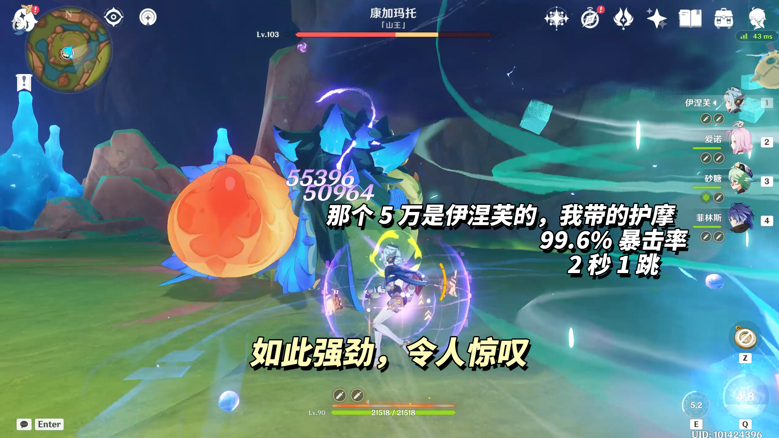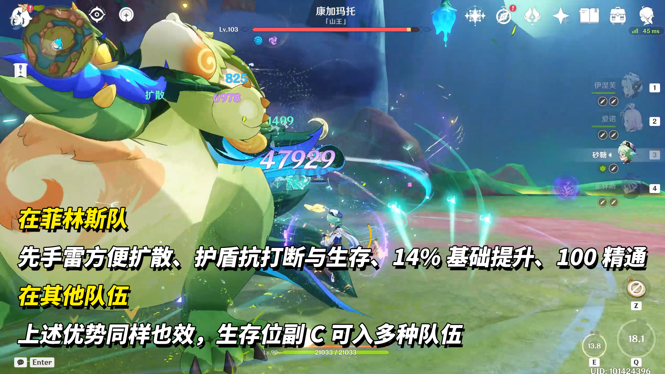接下来聊聊伊涅芙。说实话,她在卡池里出现,主要就是为了“月感电体系”服务的。如果你想玩这个体系,那她几乎是必不可少的。目前来看,她的最优配队大概是:菲林斯、伊涅芙、哥伦比娅,再加上一个砂糖。