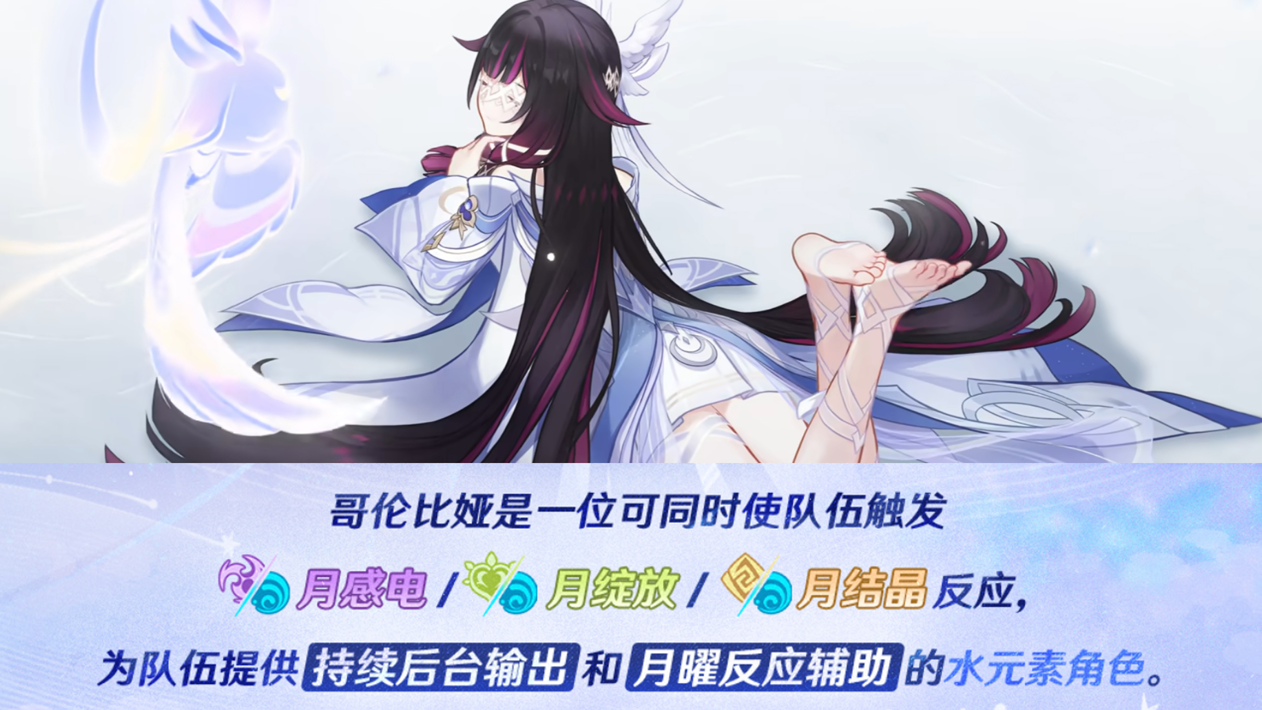 挪德卡莱的角色卡池排期一直都很紧张,而哥伦比娅这位角色,我觉得她特别有意思。她一个人就能激活月感电、月绽放、月结晶这三种反应体系,还能提供挂水和月曜增伤,这简直是低投入就能体验到多种新玩法的福音,能给你带来不少新鲜感。