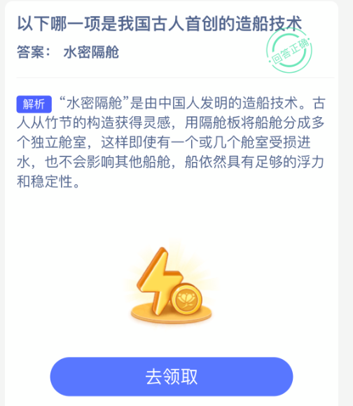 以下哪一项是我国古人首创的造船技术?【蚂蚁新村每日一题】2026年1月11日题目已发布!坚持答题,积累木兰币,即可加速小镇建设。答对本题,立即可享“产速+3/时”的加速奖励!今天正确答案是【水密隔舱】。“水密隔舱”是由中国人发明的造船技术。