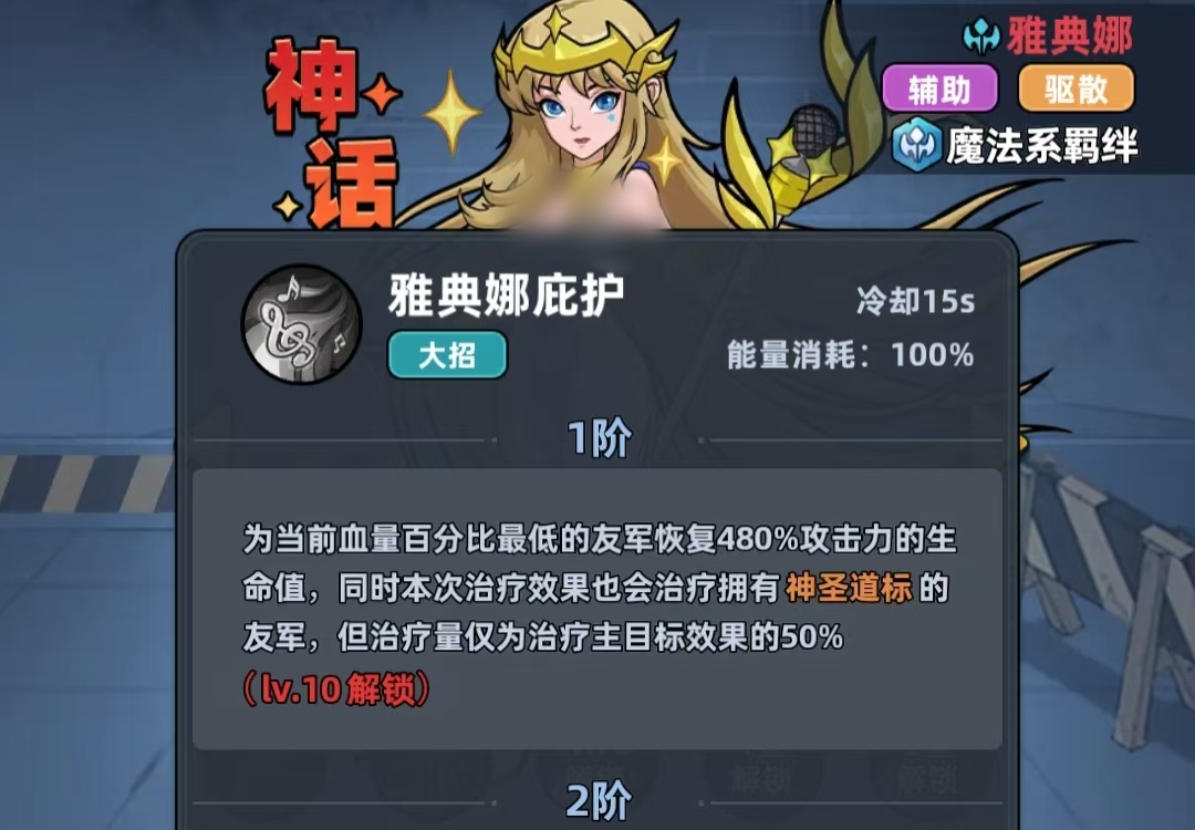雅典娜可通过自身职业特性获得10%的减伤效果,并且自身具有格挡率提高10%的幸存者特性,所以即便为辅助,雅典娜自身的生存能力也并不低。当她释放战技时,会随机挑选一名友军对其施加持续5秒的神圣道标,并且会在自己为另一名队友治疗时,让拥有神圣道标效果的友军同样能享受到本次的治疗,同时还会随机驱散一名敌人身上的两种增益。随着雅典娜的星级提升,她战技的治疗倍率也会大幅提高。